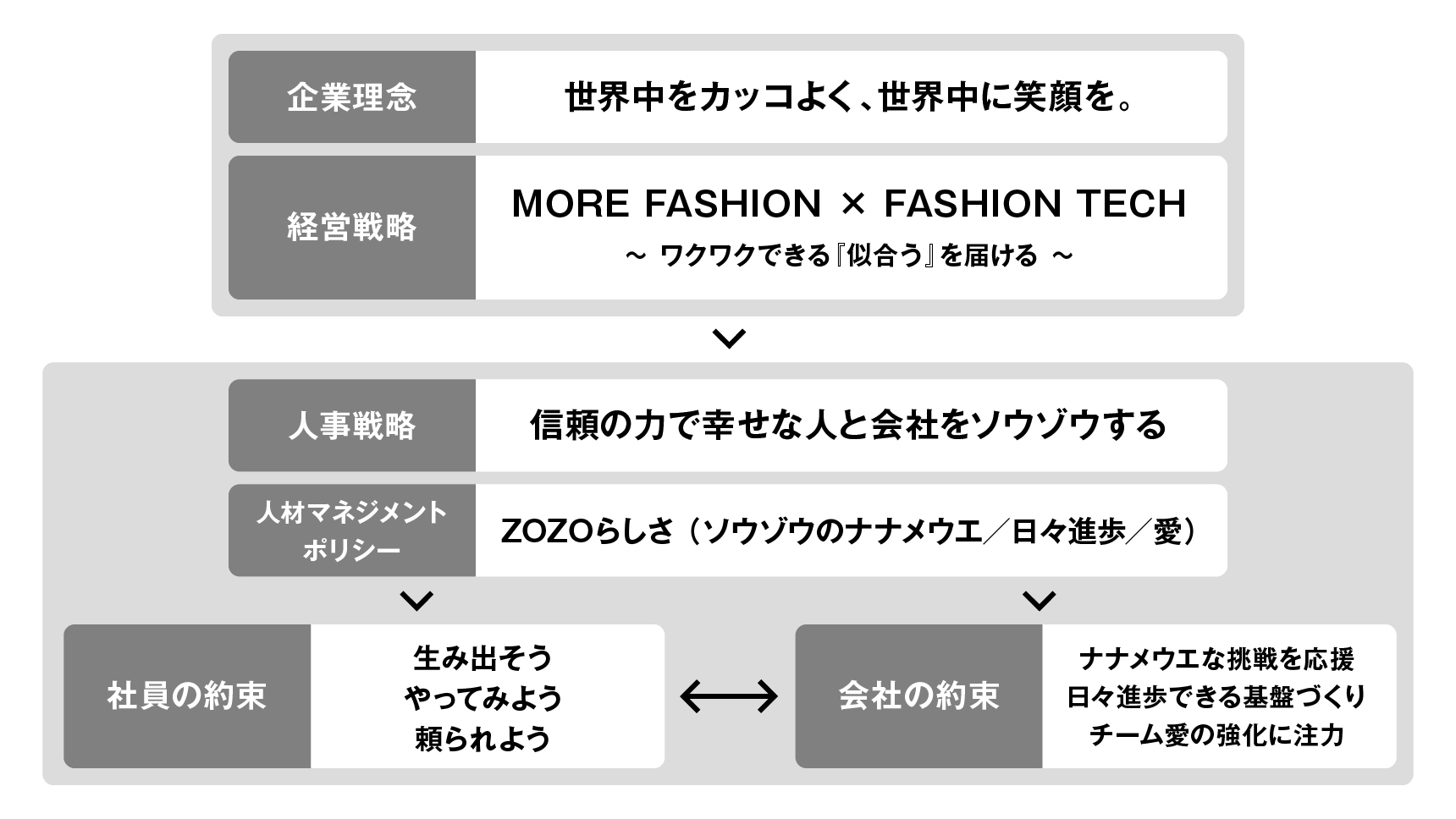 細野:戦略づくりの出発点は、「ZOZOで働く人にどうなってほしいか」という、とてもシンプルな問いでした。スタッフ一人ひとりに幸せでいてほしい。そう考える中で、共通して大切にできる価値は何かを議論し、その答えが“信頼”でした。お金や成果では測れない、人とのつながりや頼られる喜び、誰かの役に立てる実感。こうした“信頼から生まれる幸せ”こそが、ZOZOで働く喜びなのではないか、という考えに至りました。一人ひとりが主体的に力を伸ばし、それを仲間や社会に活かすことで信頼が生まれ、その積み重ねが幸せにつながっていく。そんな循環をつくりたいという思いが、この戦略の根底にあります。