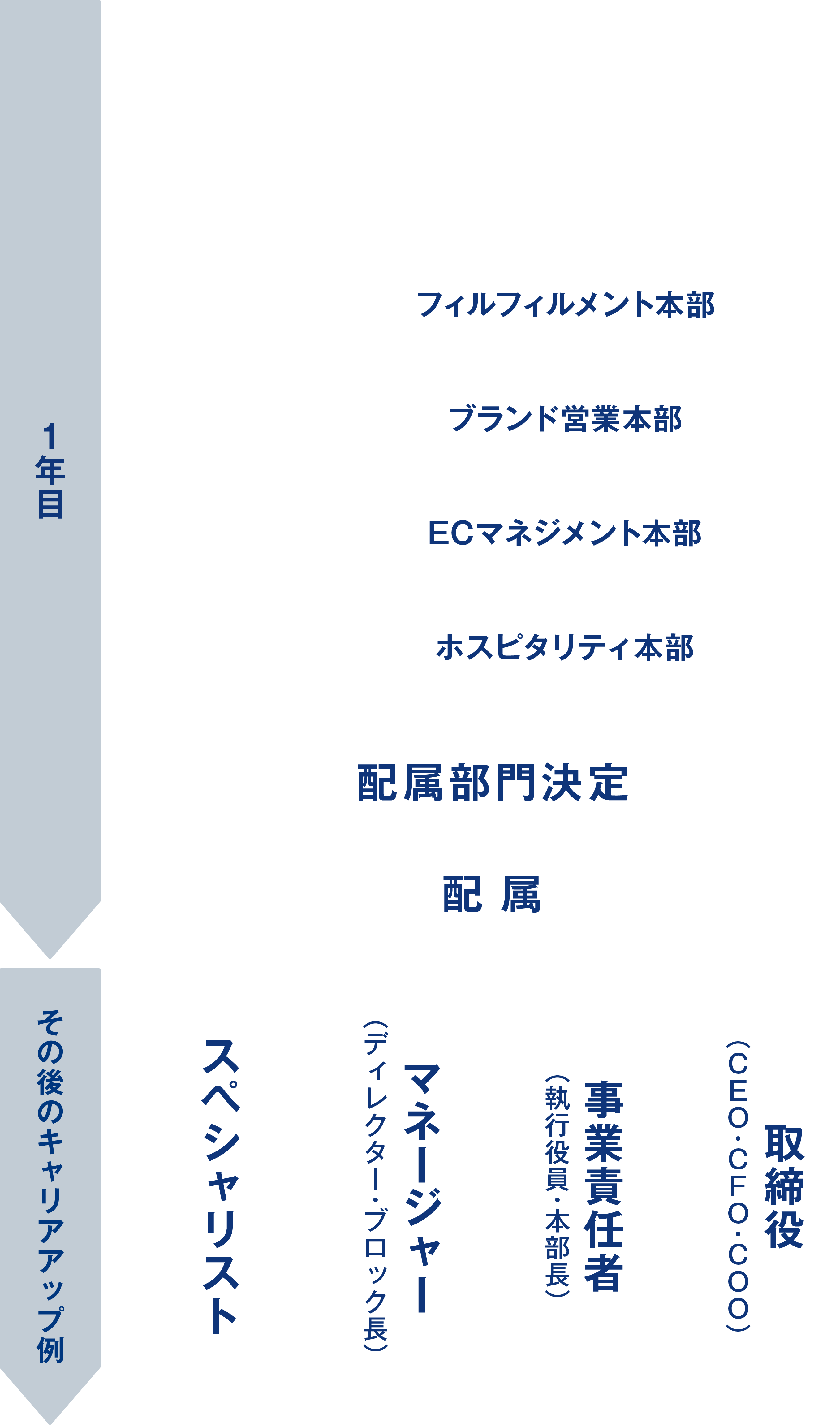 EC事業の基礎を幅広く身に付けた後、 本人のキャリア希望や適性、会社の状況を総合的に考慮して配属先を決定します。複数の部門で経験を積むことで、